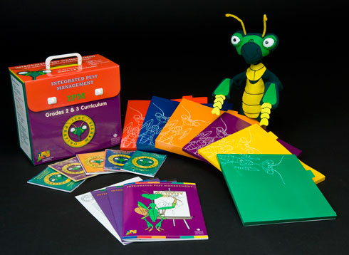 Izzy the Praying Mantis was created as the main identification symbol for the Integrated Pest Management science curriculumn packaging materials.